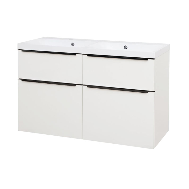 Mereo Mailo, kúpeľňová skrinka s umývadlom z liateho mramoru 121 cm, biela, čierne madlo