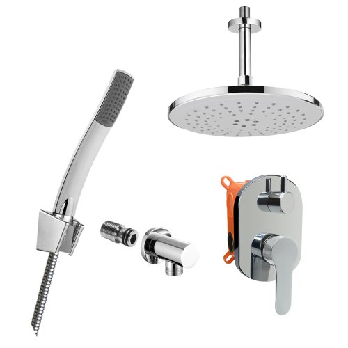 Dvojcestná podomietková batéria s keramickým prepínačom, Mbox, oválny kryt, vývod, stropné rameno, tanierová sprcha ø 220 mm sivá / chróm, držiak sprchy, špirálová hadica150 cm, jednopolohová ručná sprcha.
