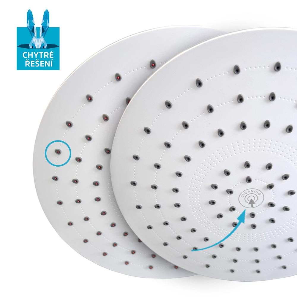 Tanierová hlavová sprcha s priemerom ø 226 mm sa vyznačuje moderným dizajnom, vysokou variabilitou a predovšetkým umožňuje takmer ľubovoľnú kombináciu s príslušenstvom sprchového programu. Funkcia spočíva v tom, že po zatlačení na tanier sprchy, vyjdú z trysiek červené "bodlinky", ktoré vytlačia von všetky usadeniny. Tanier je možné natočiť pomocou výkyvného kĺbu.Funkcia sprchy:
