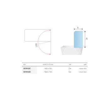 Váňová zástena je dodávaná s robustnými profilmi, bezpečnostným sklom zvislým zdvíhacím pántom.Profil vaňové zásteny je z hliníkového profilu, vo farebné úprave leštený hliník. Ako výplň je dodávané 6 mm silné bezpečnostné sklo, v dizajnu Číre.