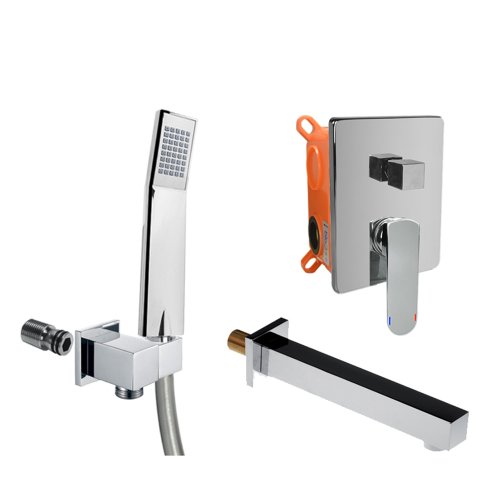 Dvojcestná podomietková batéria s keramickým prepínačom, Mbox, hranatý kryt, vývod s držiakom sprchy, šedostrieborná hadica 150 cm, jednopolohová ručná sprcha, vaňové napúšťací ramienko.10 rokov záruka na batériu.