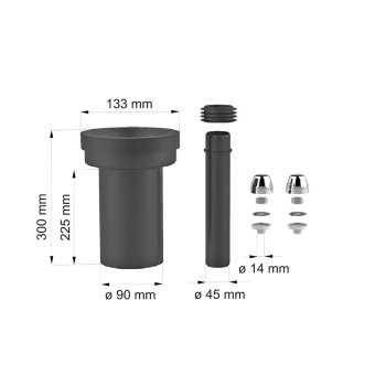 Prípojná súprava pre závesné WC, zvárateľná, materiál PE. Odtoková rúrka DN D80 / D90, dĺžka 300 mm. Prívodný rúrka Ø 45 mm s gumovou manžetou.Parametre